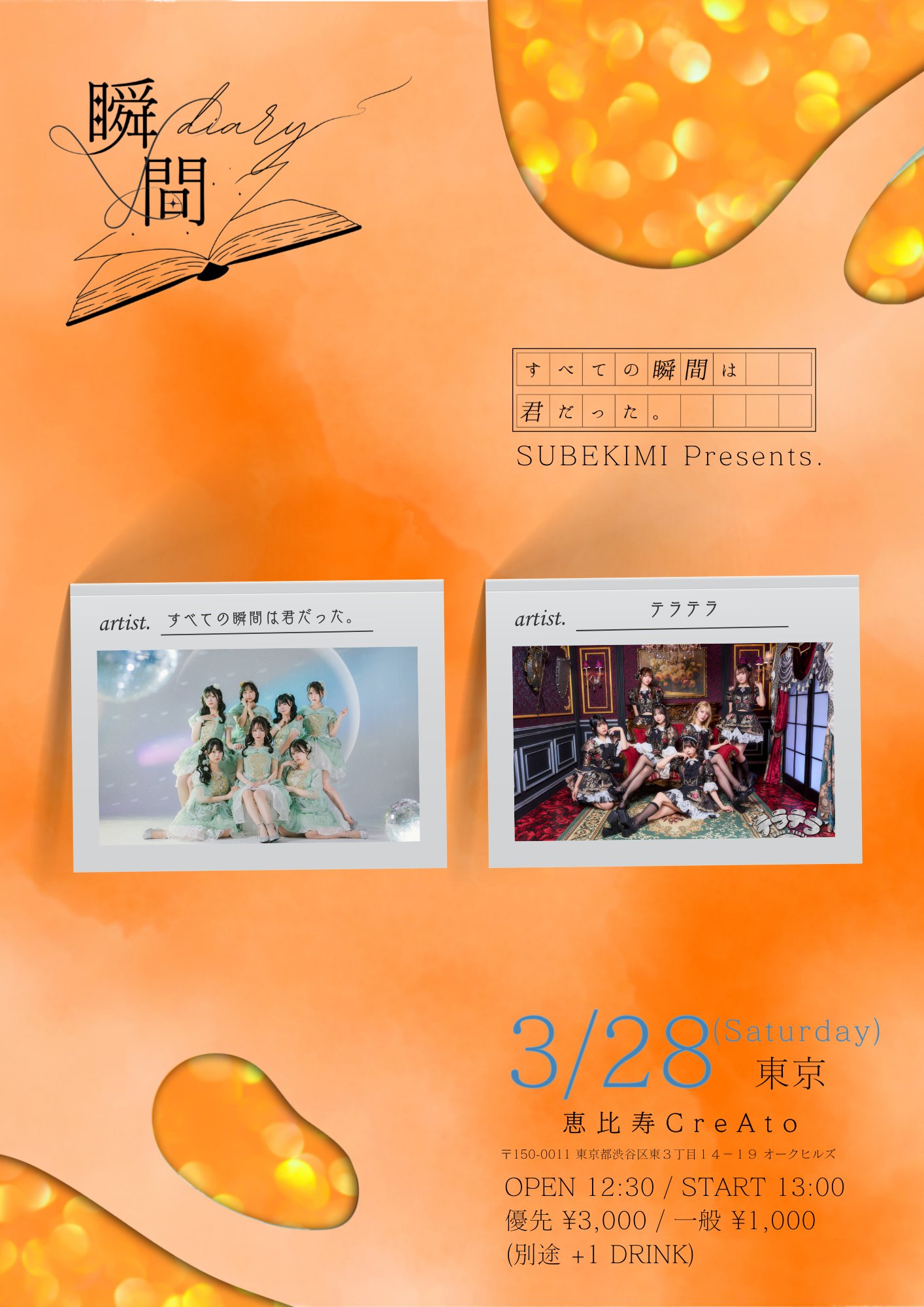 優先 : ¥3,000 / 一般 : ¥1,500 当日券 : +¥500 / +drink(¥700~)
