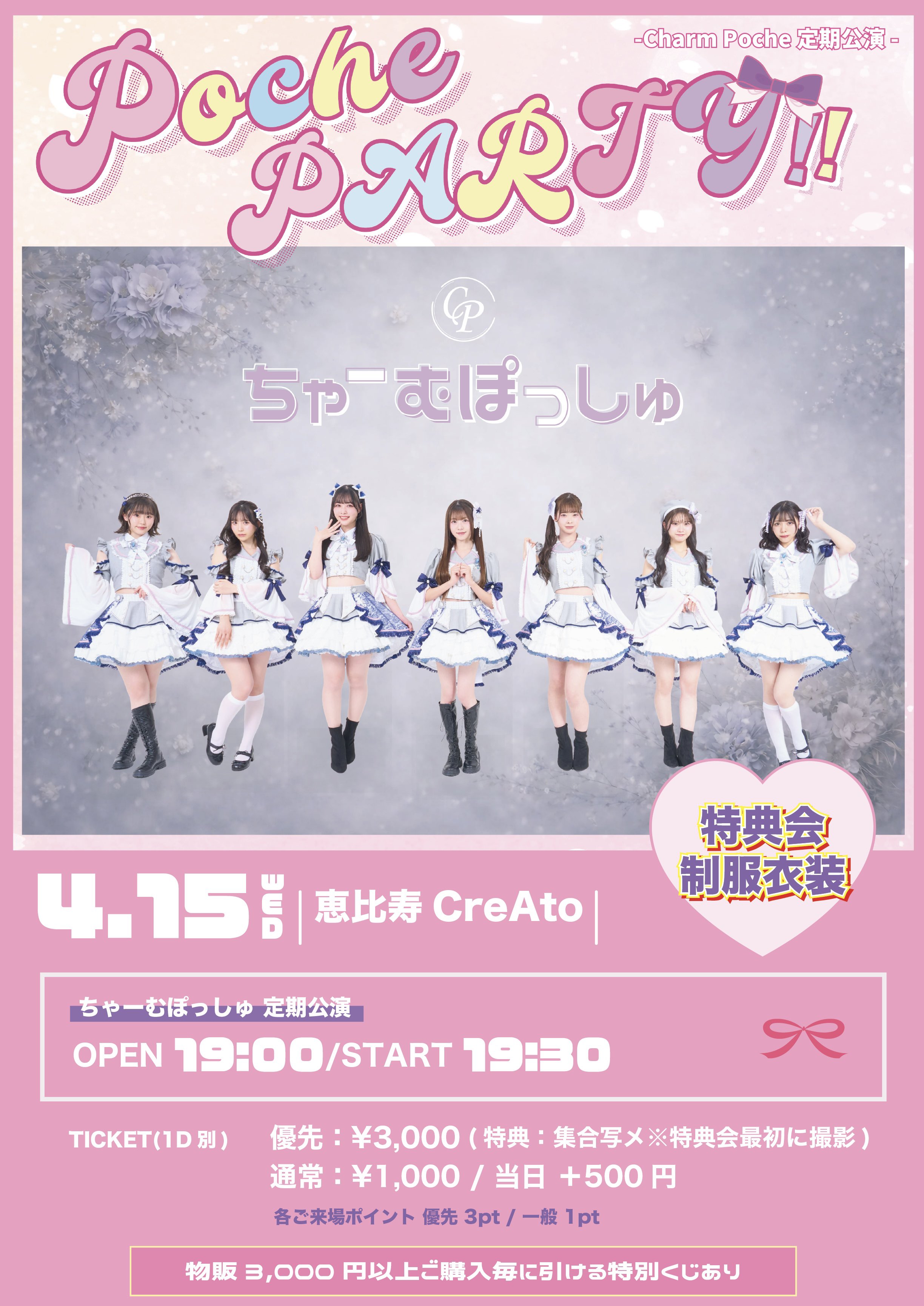 優先:¥3,000(集合写メ※特典会最初に撮影) / 一般:¥1,000 当日:+¥500 / + drink(¥700)