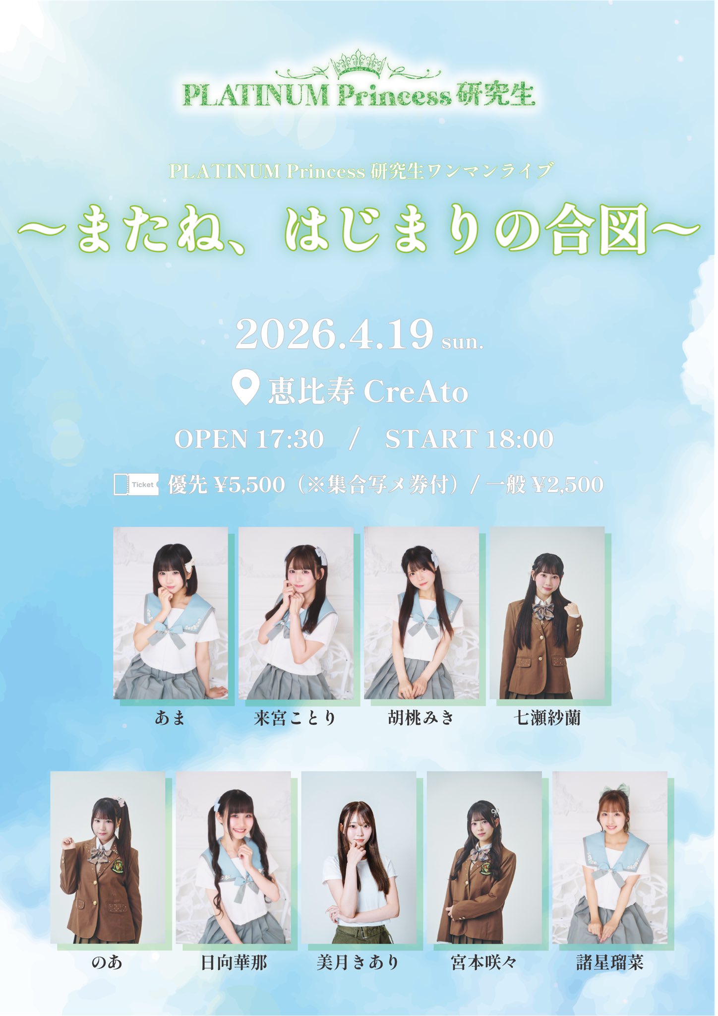 優先チケット(集合写メ券付き):¥5,500 / 一般チケット:¥2,500 /+ drink(\700)